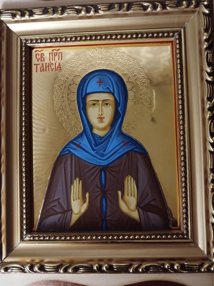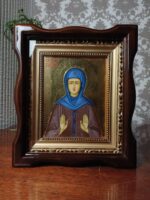 Ікона виконана з липова дошка з дубовими шпонками, ікона написана на левкасі/ ікона написана темперними фарбами / фон ікони з сусального золота / ікона оздоблена чеканим орнаментом / ікона в кіоті / кіот з вільхи / ікона під склом