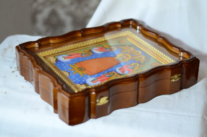 Ікона – дошка, левкас, темпера, сусальне золото, кіот, який відкривається.