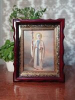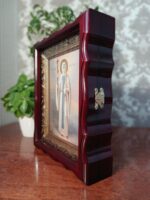 Ікона виконана з липова дошка з дубовими шпонками, ікона написана на левкасі/ ікона написана олійними фарбами / німб ікони з сусального золота / ікона в кіоті / кіот з вільхи / ікона під склом
