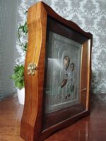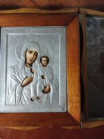Ікона написана на дошці / ікона написана олійними фарбами / ікона оздоблена срібною ризою / ікона в кіоті / кіот з червоного дерева / ікона під склом
