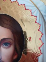 Ікона виконана з липова дошка з дубовими шпонками, ікона написана на левкасі/ ікона написана олійними фарбами / фон ікони з сусального золота / ікона оздоблена чеканим орнаментом / ікона в кіоті / кіот з вільхи / ікона під склом