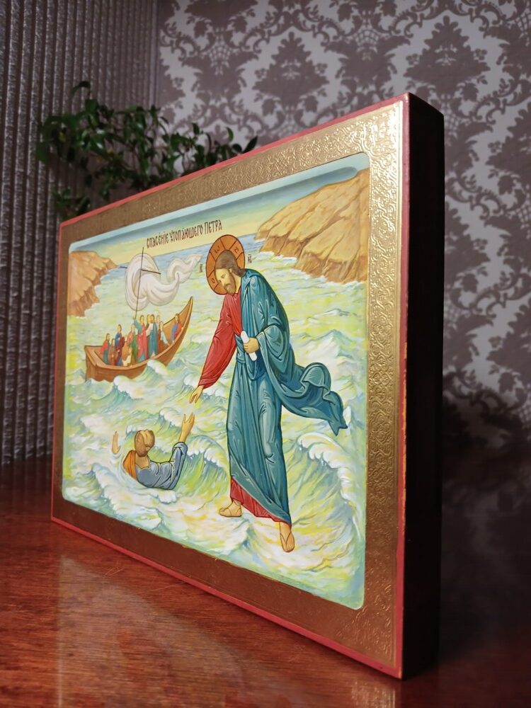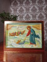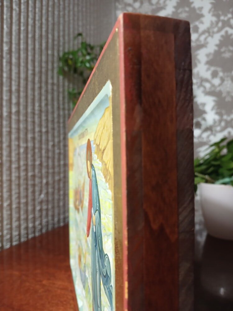 Ікона виконана з липова дошка з дубовими шпонками, ікона написана на левкасі/ ікона написана олійними фарбами / обрамлення ікони з сусального золота / ікона оздоблена чеканим орнаментом