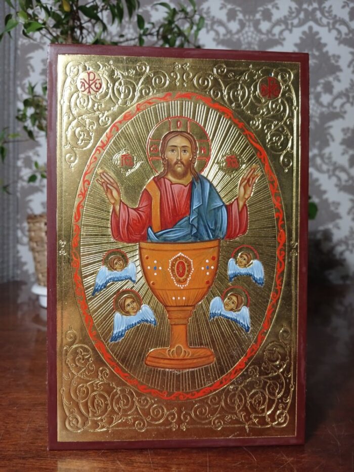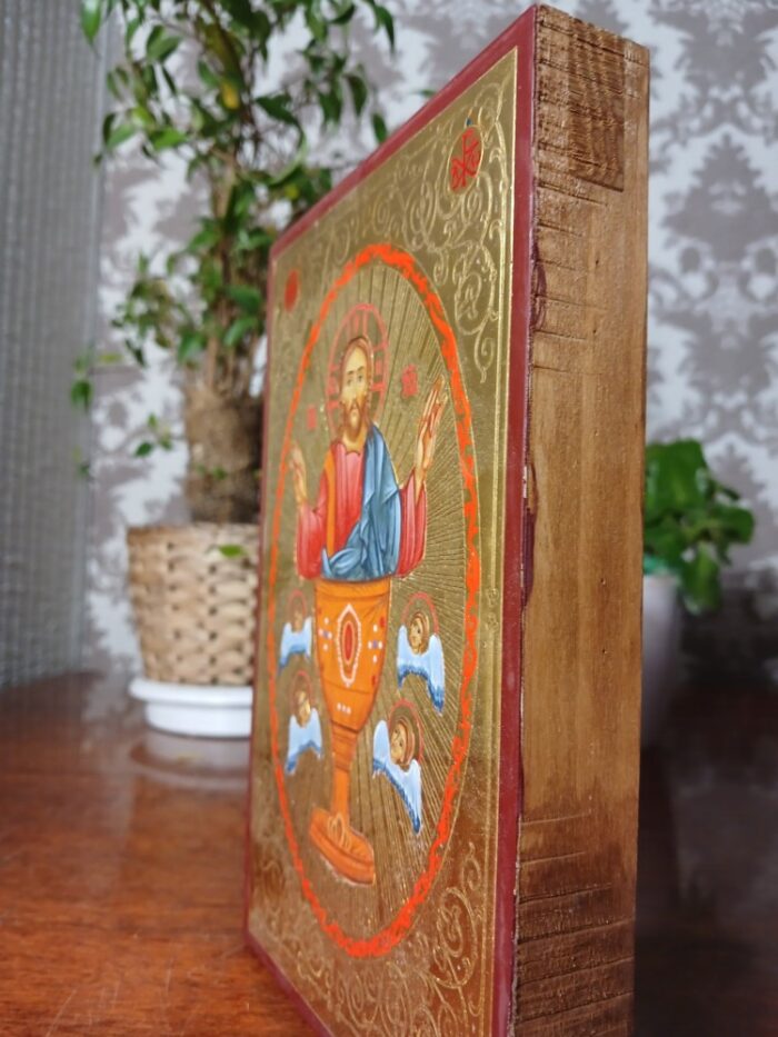 Ікона виконана з липова дошка з дубовими шпонками, ікона написана на левкасі/ ікона написана темперними фарбами / фон ікони з сусального золота / ікона оздоблена чеканим орнаментом