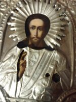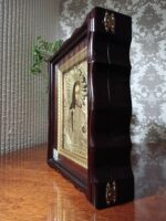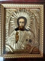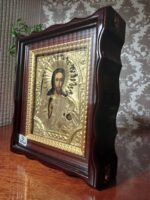 Ікона написана на дошці / ікона написана олійними фарбами / ікона оздоблена чеканою ризою / ікона в кіоті / рамка кіота оздоблена різбленою косичкою / ікона під склом