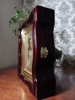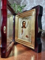 Ікона написана на дошці / ікона написана олійними фарбами / ікона оздоблена латунною чеканою ризою з посрібленням / ікона в кіоті / кіот з вільхи /рамка ківота покрита сусальним золотом/ ікона під склом