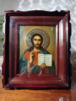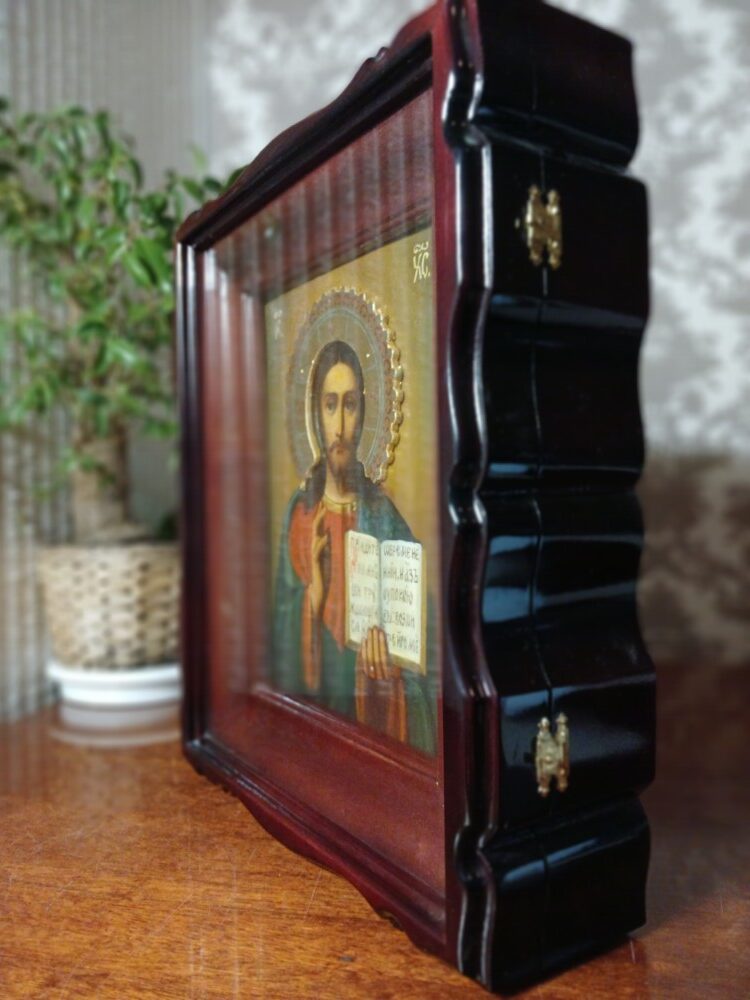 Ікона написана на дошці / ікона написана олійними фарбами / ікона оздоблена накладним німом покритим сусальним золотом / ікона в кіоті / кіот з вільхи / ікона під склом