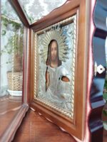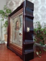 Ікона написана на дошці / ікона написана олійними фарбами / ікона оздоблена латунною ризою з посрібленням / ікона в кіоті / кіот з вільхи / ікона під склом