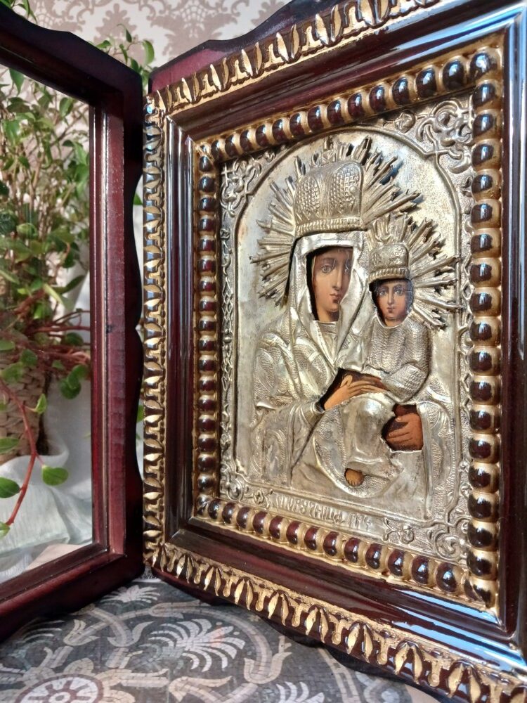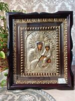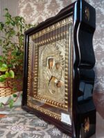 Ікона написана на дошці / ікона написана олійними фарбами / ікона оздоблена латунною ризою з покриттям золотом та сріблом / ікона в кіоті / кіот з вільхи / ікона під склом