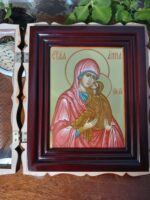 Ікона виконана з липова дошка з дубовими шпонками, ікона написана на левкасі/ ікона написана темперними фарбами / фон ікони з сусального золота / ікона в кіоті / кіот з вільхи / ікона під склом