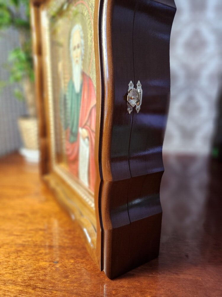 Ікона – липова дошка, дубові шпонки, левкас, олійні фарби, сусальне золото, лакове покриття.
