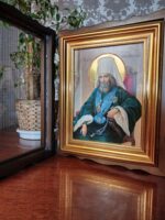 Ікона виконана з липова дошка з дубовими шпонками, ікона написана на левкасі/ ікона написана олійними фарбами / німб ікони з сусального золота / ікона в кіоті / кіот з вільхи / ікона під склом