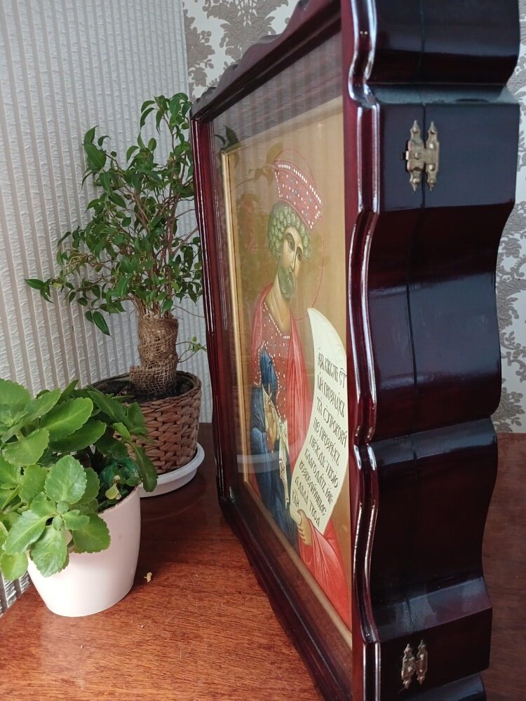 Ікона виконана з липова дошка з дубовими шпонками, ікона написана на левкасі/ ікона написана темперними фарбами / фон ікони з сусального золота / ікона в кіоті / кіот з вільхи / ікона під склом