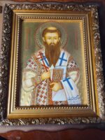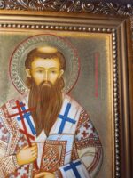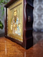 Ікона виконана з липова дошка з дубовими шпонками, ікона написана на левкасі/ ікона написана темперними фарбами / фон ікони з сусального золота / ікона оздоблена чеканим орнаментом / ікона в кіоті / кіот з вільхи / ікона під склом