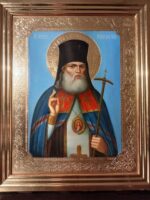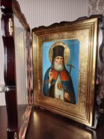 Ікона виконана з липова дошка з дубовими шпонками, ікона написана на левкасі/ ікона написана олійними фарбами / фон ікони з сусального золота / ікона оздоблена чеканим орнаментом / ікона в кіоті / кіот з вільхи / ікона під склом