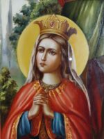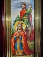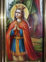 Ікона виконана з липова дошка з дубовими шпонками, ікона написана на левкасі/ ікона написана темперними фарбами / німб святої на іконі з сусального золота / ікона в кіоті / кіот з вільхи / ікона під склом
