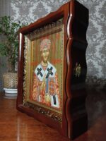 Ікона виконана з липова дошка з дубовими шпонками, ікона написана на левкасі/ ікона написана темперними фарбами / фон ікони з сусального золота / ікона оздоблена чеканим орнаментом / ікона в кіоті / кіот з вільхи / ікона під склом