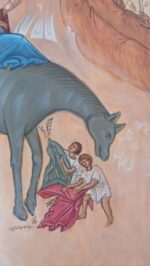 Ікона виконана з липова дошка з дубовими шпонками, ікона написана на левкасі/ ікона написана темперними фарбами / фон ікони з сусального золота / ікона оздоблена чеканим орнаментом з ємалевим покриттям / ікона в кіоті / кіот з вільхи / ікона під склом