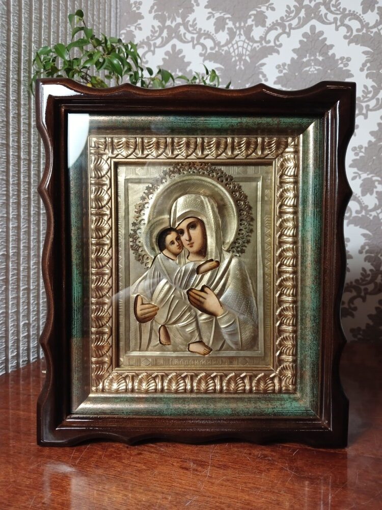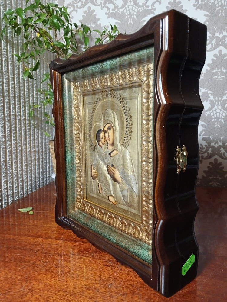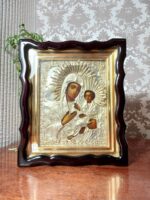 Ікона написана на дошці / ікона написана олійними фарбами / ікона лздоблена чеканою ризою с позолотою / ікона в кіоті / рамка кіота покрита сусальним золотом / ікона під склом