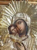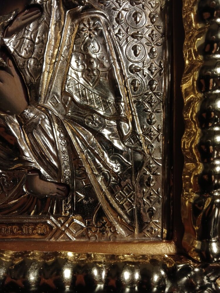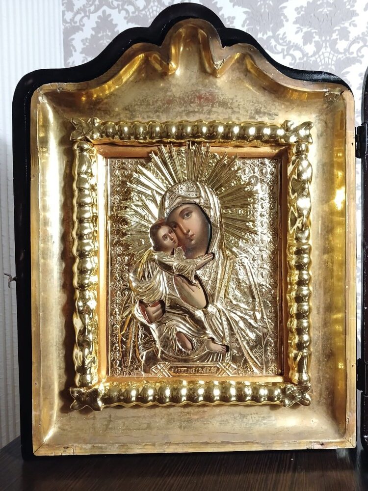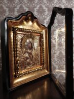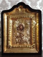 Ікона написана на дошці / ікона написана олійними фарбами / ікона оздоблена чеканою ризою з позолотою / ікона в кіоті / кіот з вільхи / ікона під склом