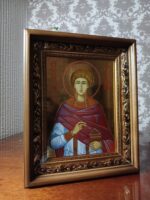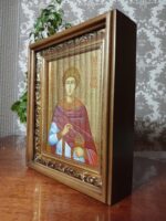 Ікона виконана з липова дошка з дубовими шпонками, ікона написана на левкасі/ ікона написана темперними фарбами / фон ікони з сусального золота / ікона оздоблена чеканим орнаментом / ікона в кіоті / кіот з вільхи / ікона під склом