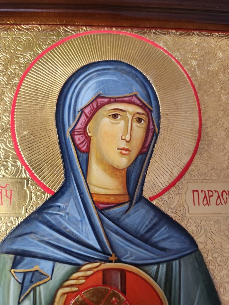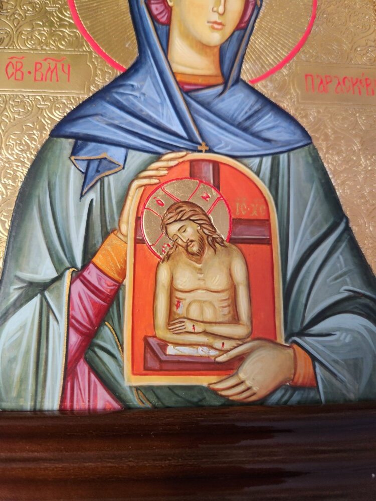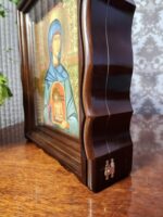 Ікона виконана з липова дошка з дубовими шпонками, ікона написана на левкасі/ ікона написана темперними фарбами / фон ікони з сусального золота / ікона оздоблена чеканим орнаментом / ікона в кіоті / кіот з вільхи / ікона під склом