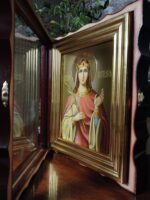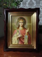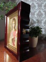 Ікона виконана з липова дошка з дубовими шпонками, ікона написана на левкасі/ ікона написана олійними фарбами / німб ікони з сусального золота / ікона в кіоті / кіот з вільхи /рамка в ківоті покрита сусальним золотом/ ікона під склом