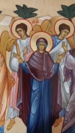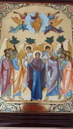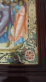 Ікона виконана з липова дошка з дубовими шпонками, ікона написана на левкасі/ ікона написана темперними фарбами / фон ікони з сусального золота / ікона оздоблена чеканим орнаментом з ємалевим покриттям / ікона в кіоті / кіот з вільхи / ікона під склом