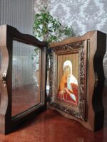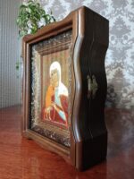 Ікона виконана з липова дошка з дубовими шпонками, ікона написана на левкасі/ ікона написана темперними фарбами / фон ікони з сусального золота / ікона оздоблена чеканим орнаментом / ікона в кіоті / кіот з вільхи / ікона під склом