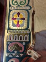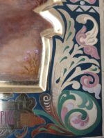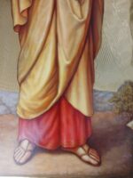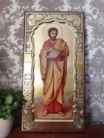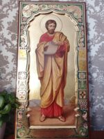 Ікона виконана з липова дошка з дубовими шпонками, ікона написана на левкасі/ ікона написана олійними фарбами / фон ікони з сусального золота / ікона оздоблена чеканим орнаментом з ємалевим покриттям / ікона в кіоті / кіот з вільхи / ікона під склом
