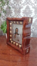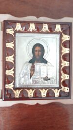 Ікона написана на дошці / ікона написана олійними фарбами / ікона оздоблена срібною чеканою ризою 925 проби / ікона в кіоті / рамка кіота частково покрита сусальним золотом / ікона під склом