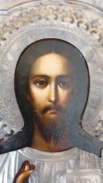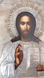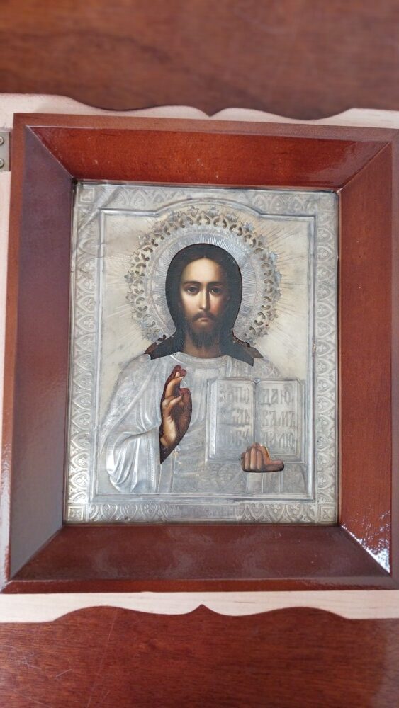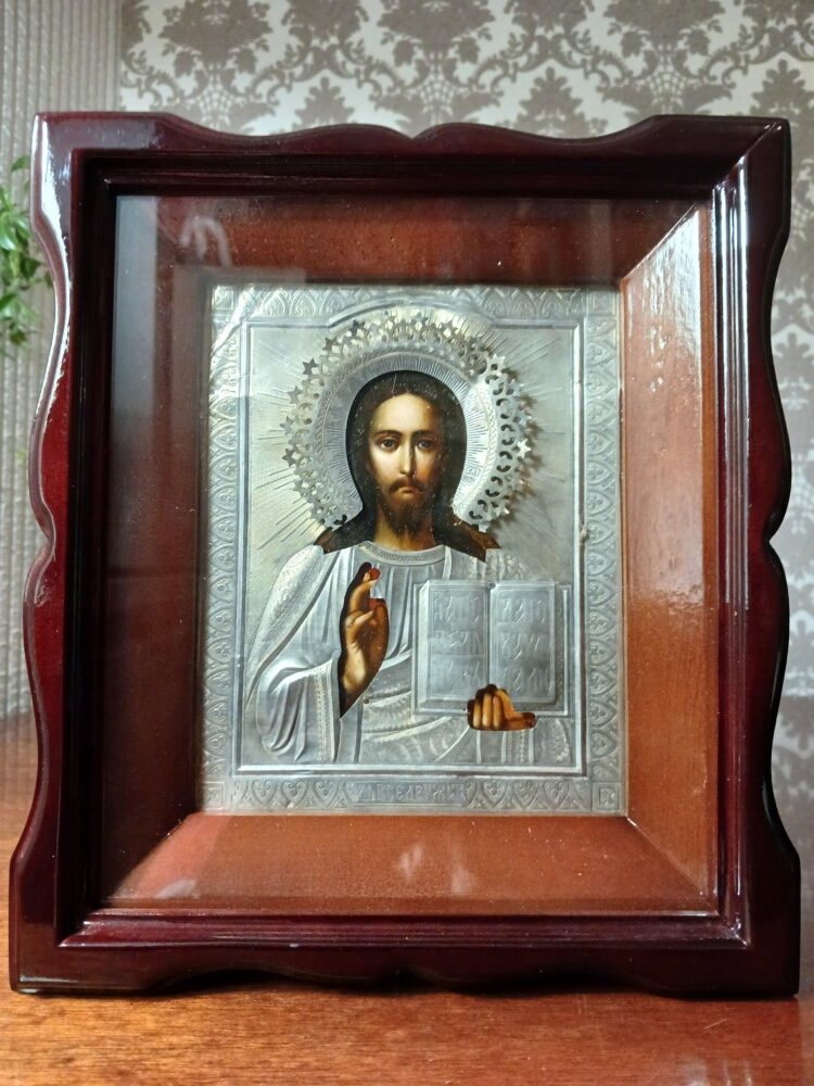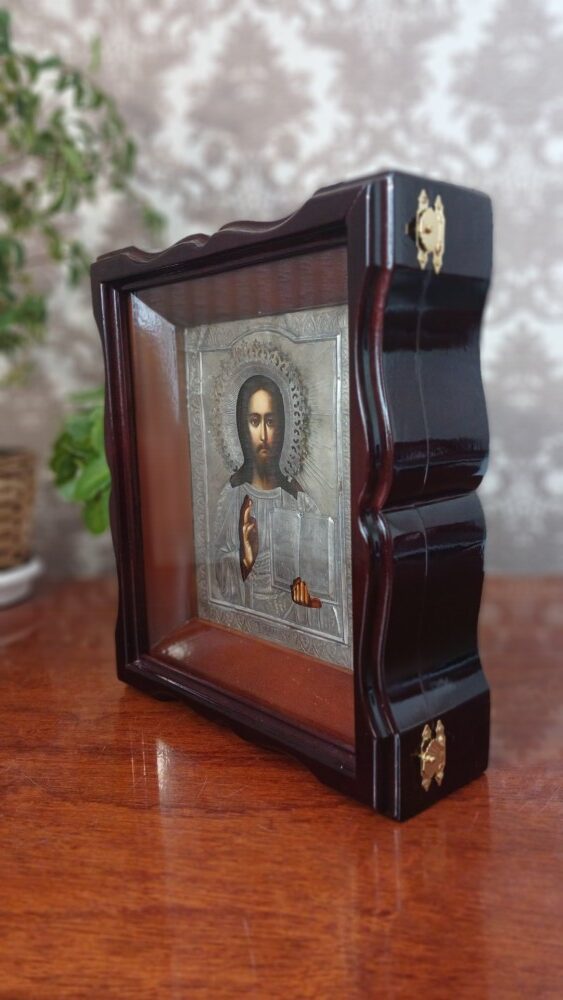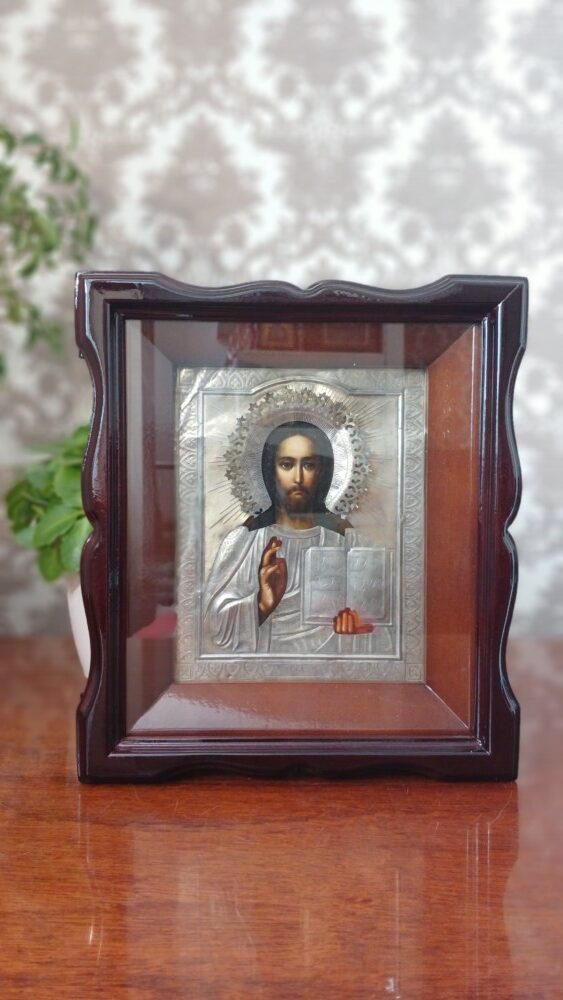 Ікона написана на дошці / ікона написана олійними фарбами / ікона оздоблена срібною чеканою ризою 925 проби / ікона в кіоті / кіот з вільхи / ікона під склом